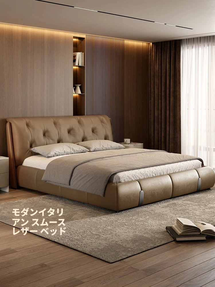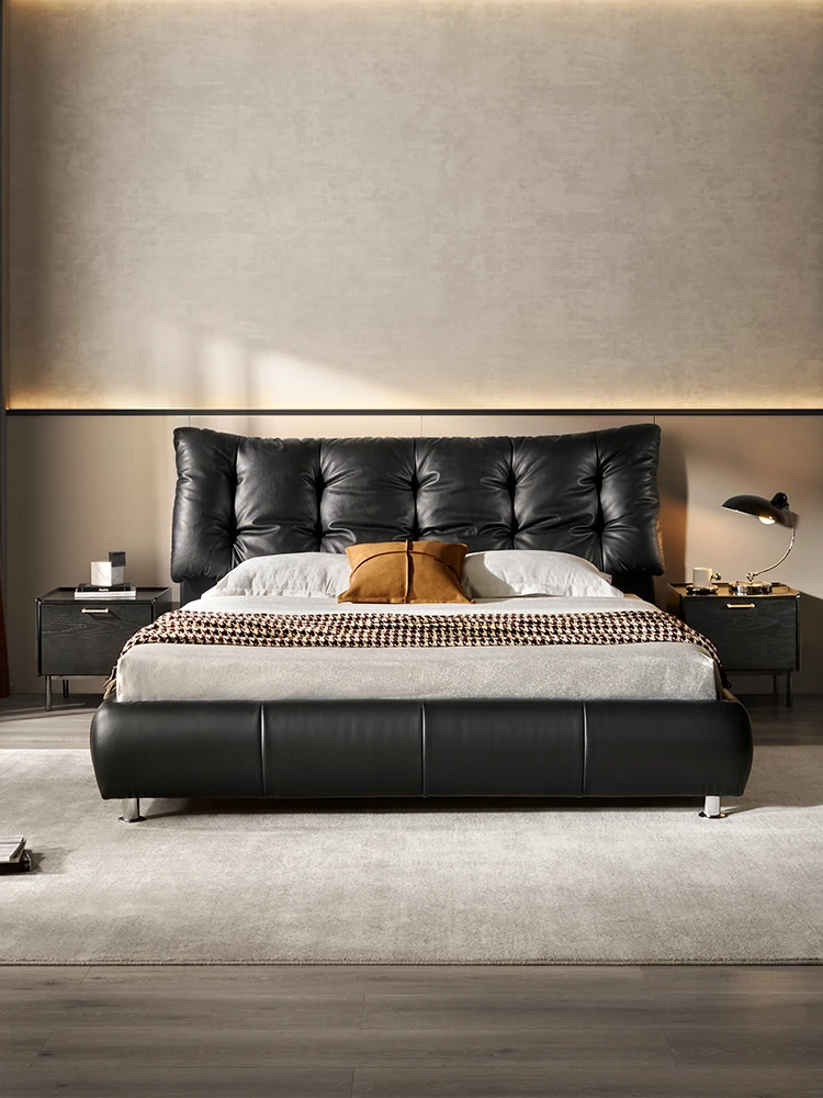 顾家居公式イタリアンモダンラグジュアリー!高級ダックフェザークッション付き本革ダブルベッド「ブラックブル」シリーズ - 主寝室に最適なシンプルデザイン