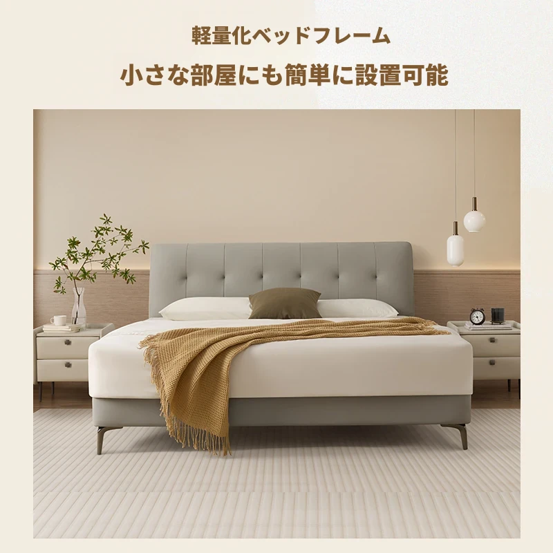 【安心品質】GUKAオフィシャル布製ベッド - 現代シンプルなデザイン、浮遊感のある快適ダブルベッド (9155) - 主寝室にぴったりのクリーム色コーディネート!