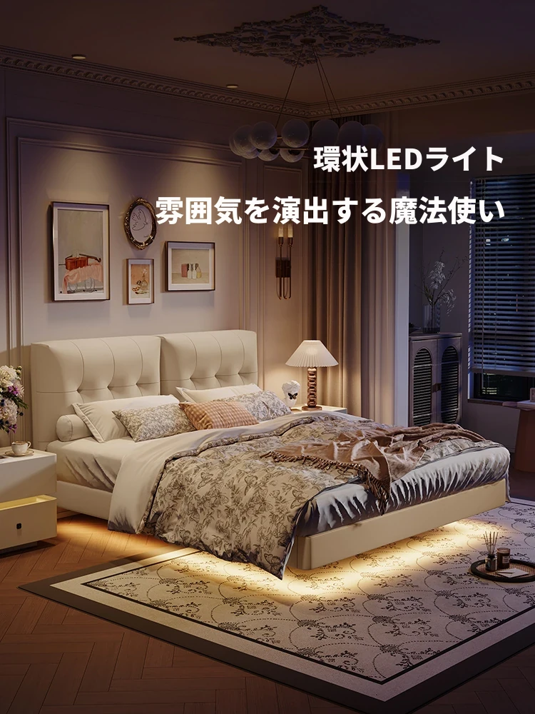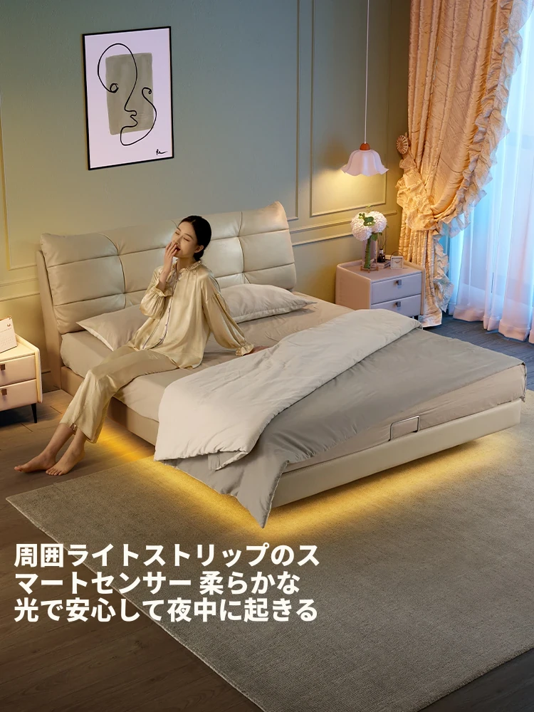 【豪华舒适】顾家家居:フレンチクリーム風のモダンなシンプルデザイン、レザーフローティングベッド - エレガントなダブルベッドで主寝室にぴったり!本物のレザーと豪華なグースフェザークッションで快適な眠りを。8155モデル