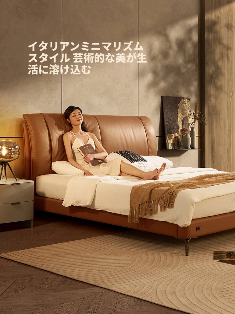 久居ホームのモダンミニマリストイタリアンラグジュアリー:柔らかな一級牛革を使用した腰部サポート機能付き主寝室用ダブルベッド(モデル8301)- 極上の快適さとスタイリッシュなデザインで、あなたの寝室をワンランク上の空間に。