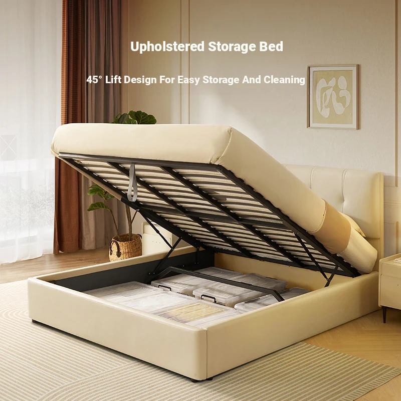 Gujia Home Modern French-Inspired Minimalist Creamy Tech Fabric Double Bed for Small Bedrooms with Storage, Model 9072 - Perfect Blend of Style and Functionality