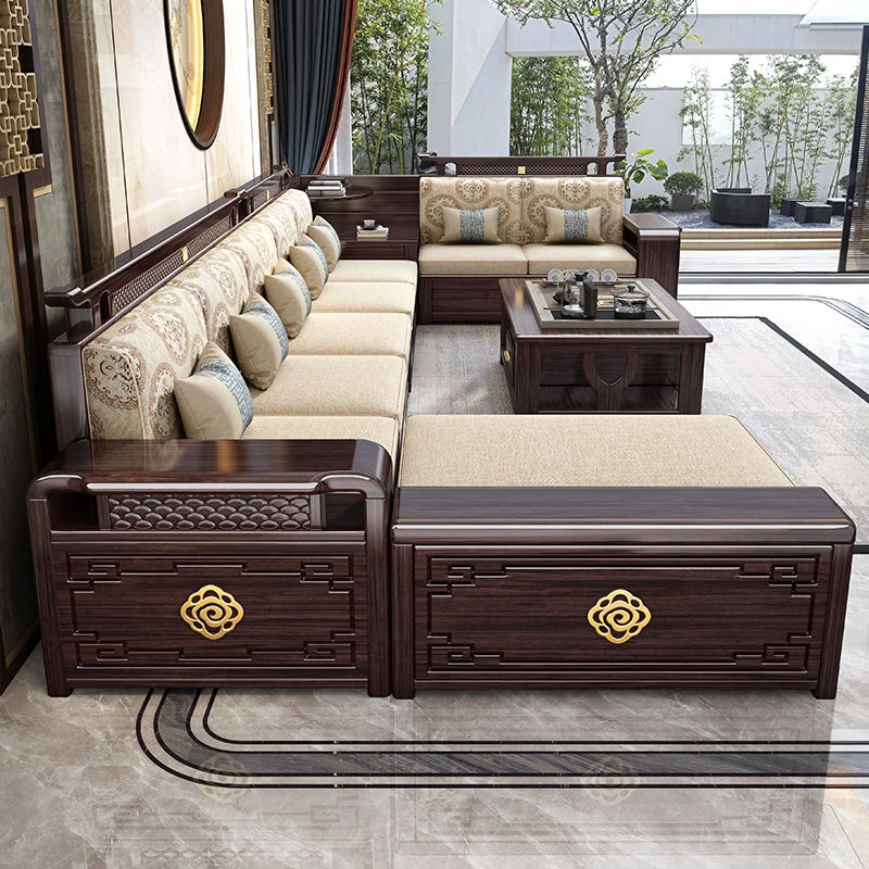 New Chinese Solid Wood Sofa Set - Luxurious Purple Golden Sandalwood Chaise Lounge with Corner Design, Dual-Season Use, and Ample Storage. Perfect for Your Living Room!
