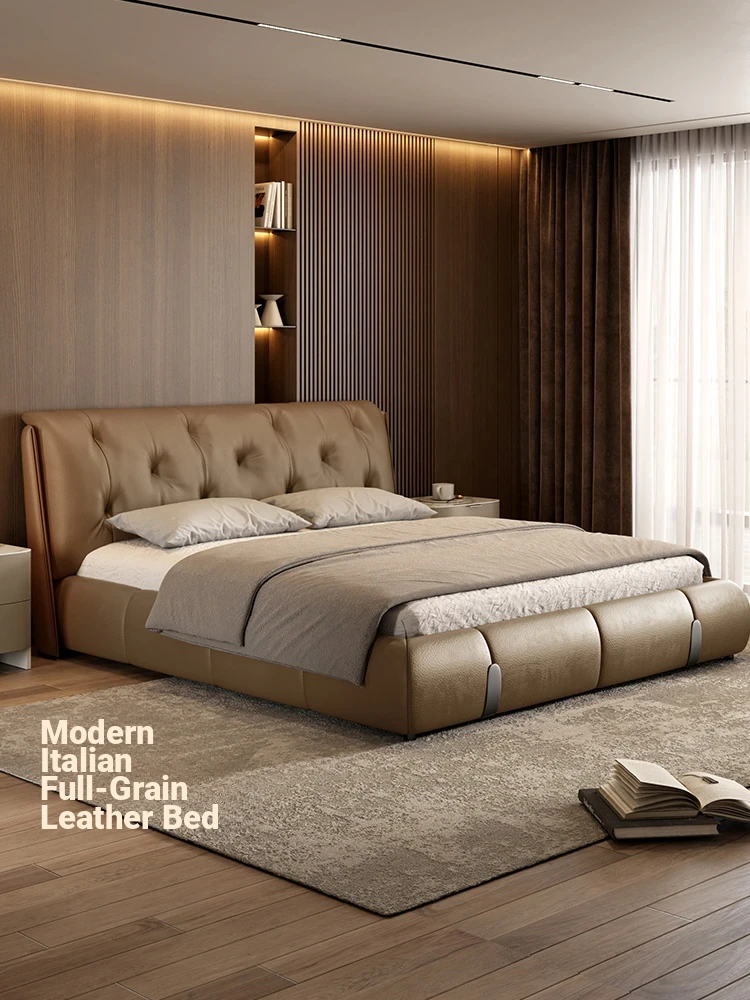 Gujia Home Modern Italian Style Feather Soft Backrest Leather Bed Frame - Luxurious Double Bed for Your Master Bedroom DS8228B