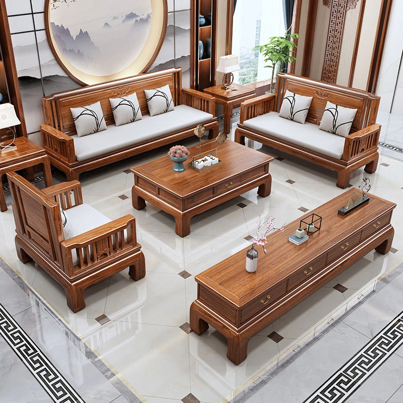 【新発売】モダン中華スタイルのオウキン木製ソファセット―冬夏兼用のクラシック古風リビング家具!